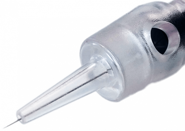 Long taper of lange punt aan het uiteinde van de naald. Hiermee kan je heel verfijnd werken. De naald is wel scherper en is er meer risico op kwetsuur.